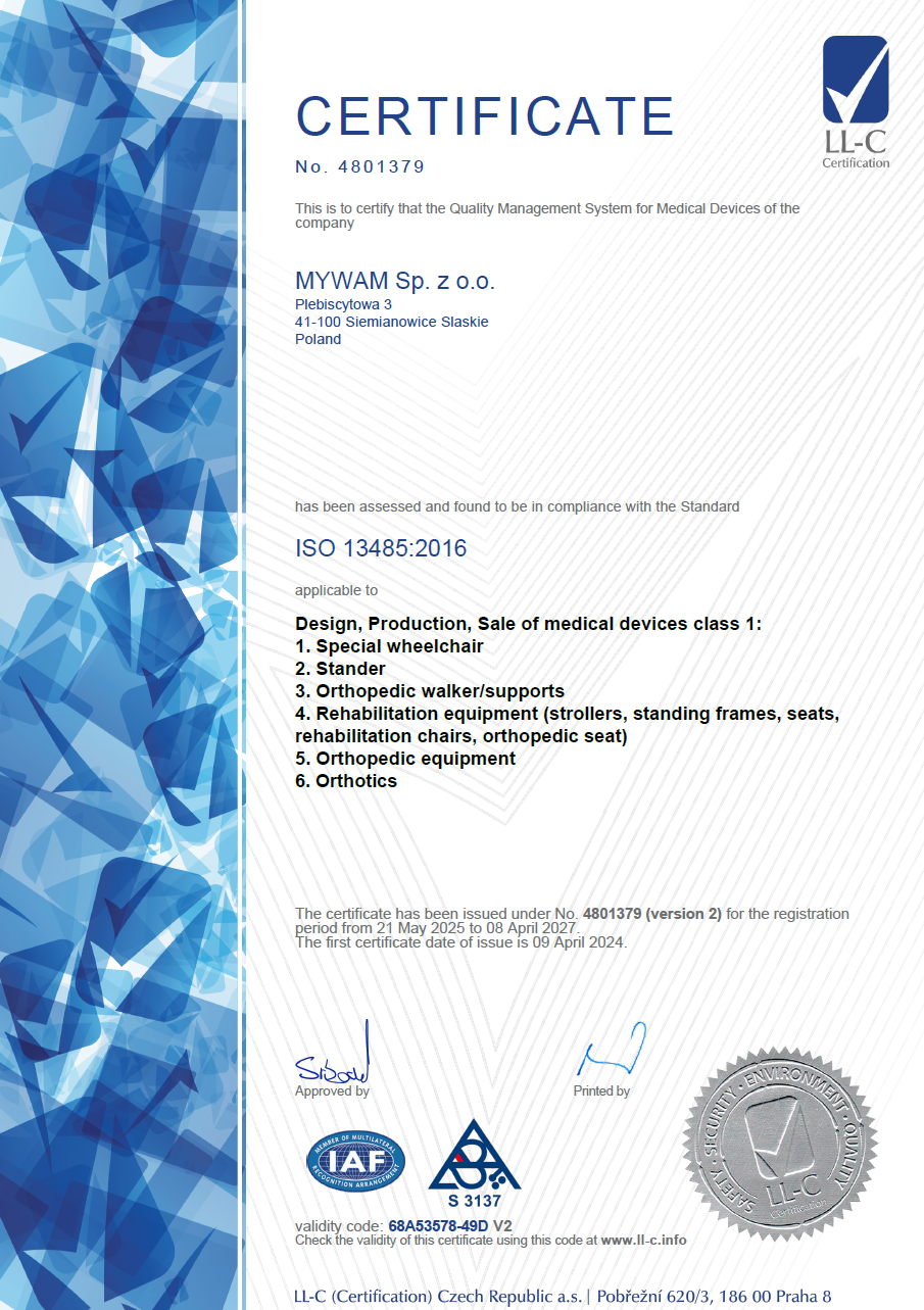 MyWam Sp. z o.o. has implemented and consistently maintains a quality management system in accordance with the requirements of the ISO 13485 standard, covering the design, manufacture and sale of Class I medical devices. Certification granted by LL-C (Certification) confirms that all processes related to the creation of our products are carried out in a controlled, documented manner and in compliance with international standards.
