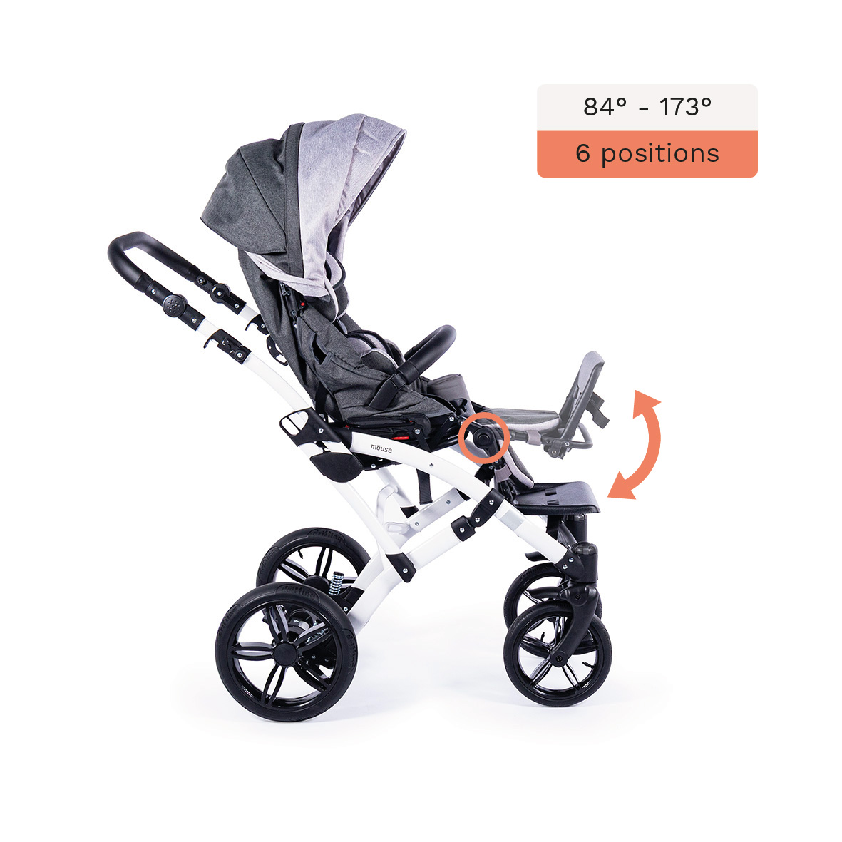 Special needs stroller Mouse is designed for young children (80–110 cm, up to 30 kg). Its sturdy frame combined with smooth handling makes the stroller ideal for everyday use.