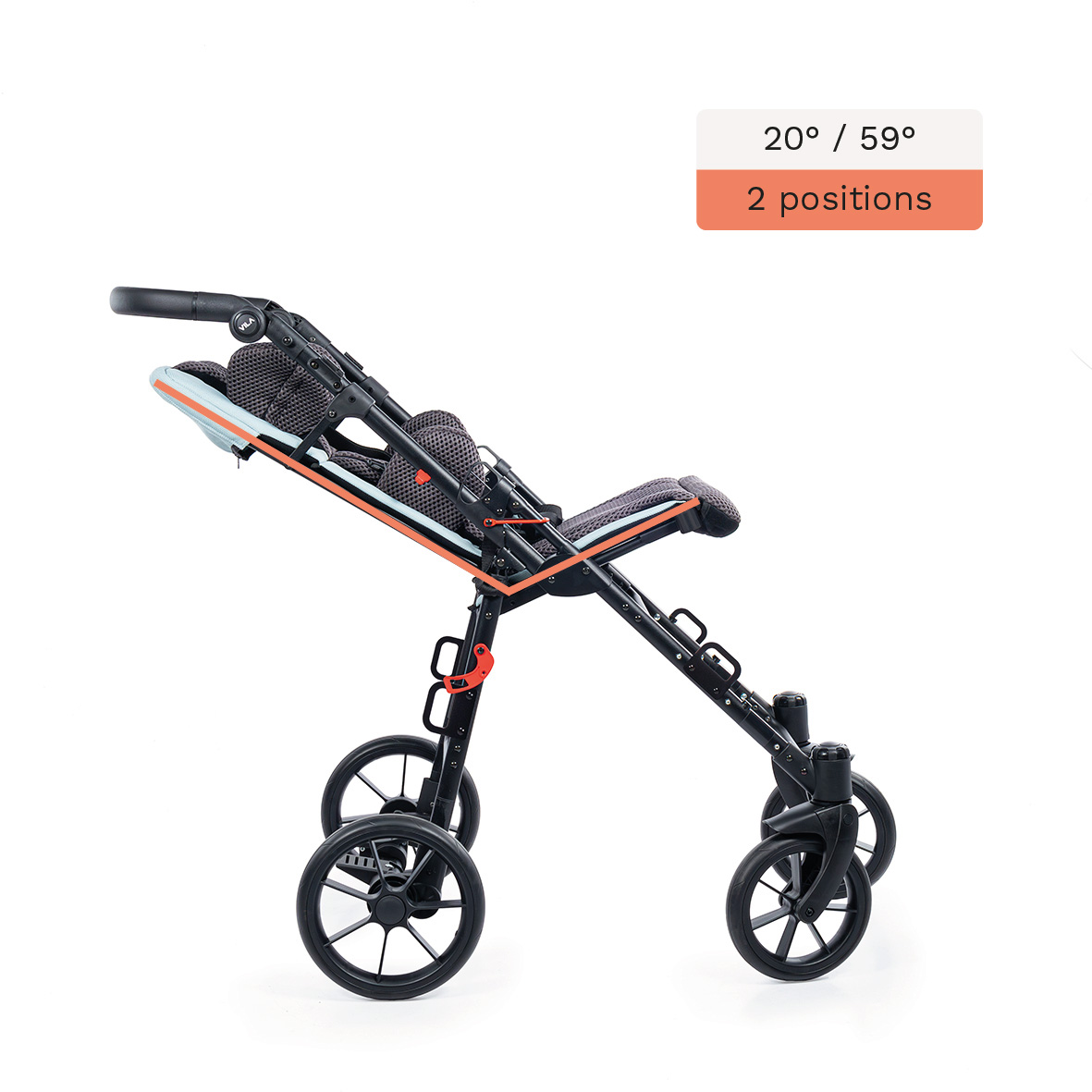 The Vila stroller can be easily adjusted to the child’s height by modifying the seat depth and using the regulated pads, abduction wedge, and the adjustable footrest. As the child grows, adjusting the settings is enough to maintain comfort and proper leg support.