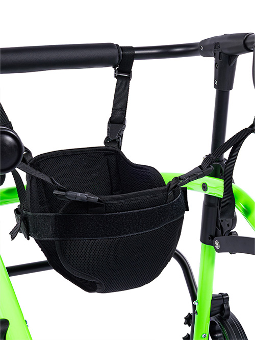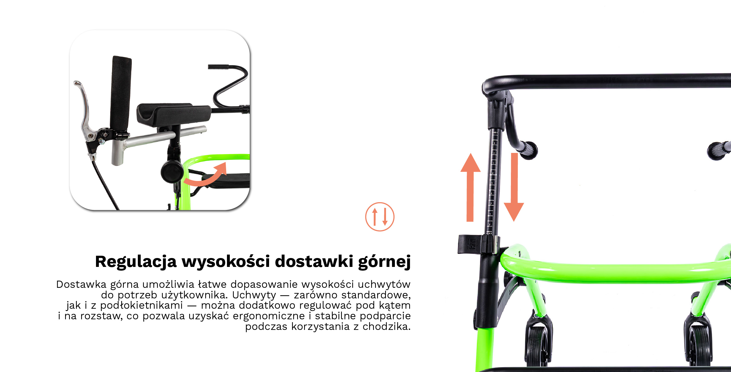 Chodzik wyposażono w regulowaną nadstawkę górną, która umożliwia dostosowanie wysokości uchwytów do wzrostu użytkownika. Zarówno uchwyty, jak i uchwyty z podłokietnikami mają regulowany kąt nachylenia, co pozwala zmieniać ich rozstaw i dopasować je do szerokości barków. Dodatkowo zestaw pelot biodrowych można regulować na szerokość, wysokość oraz na boki ramy, co ułatwia precyzyjne dopasowanie podparcia.