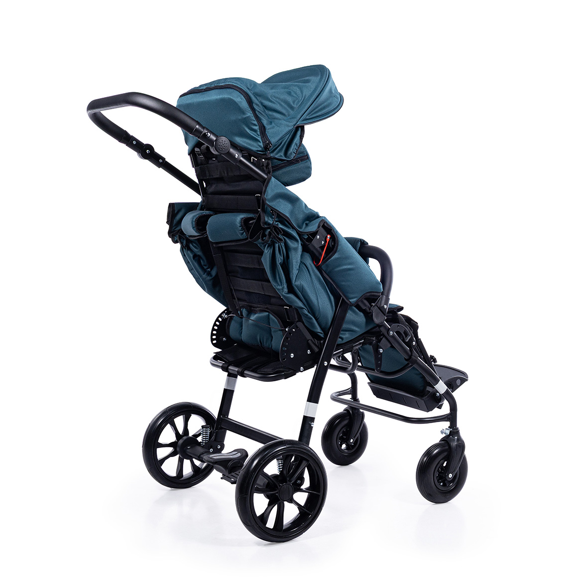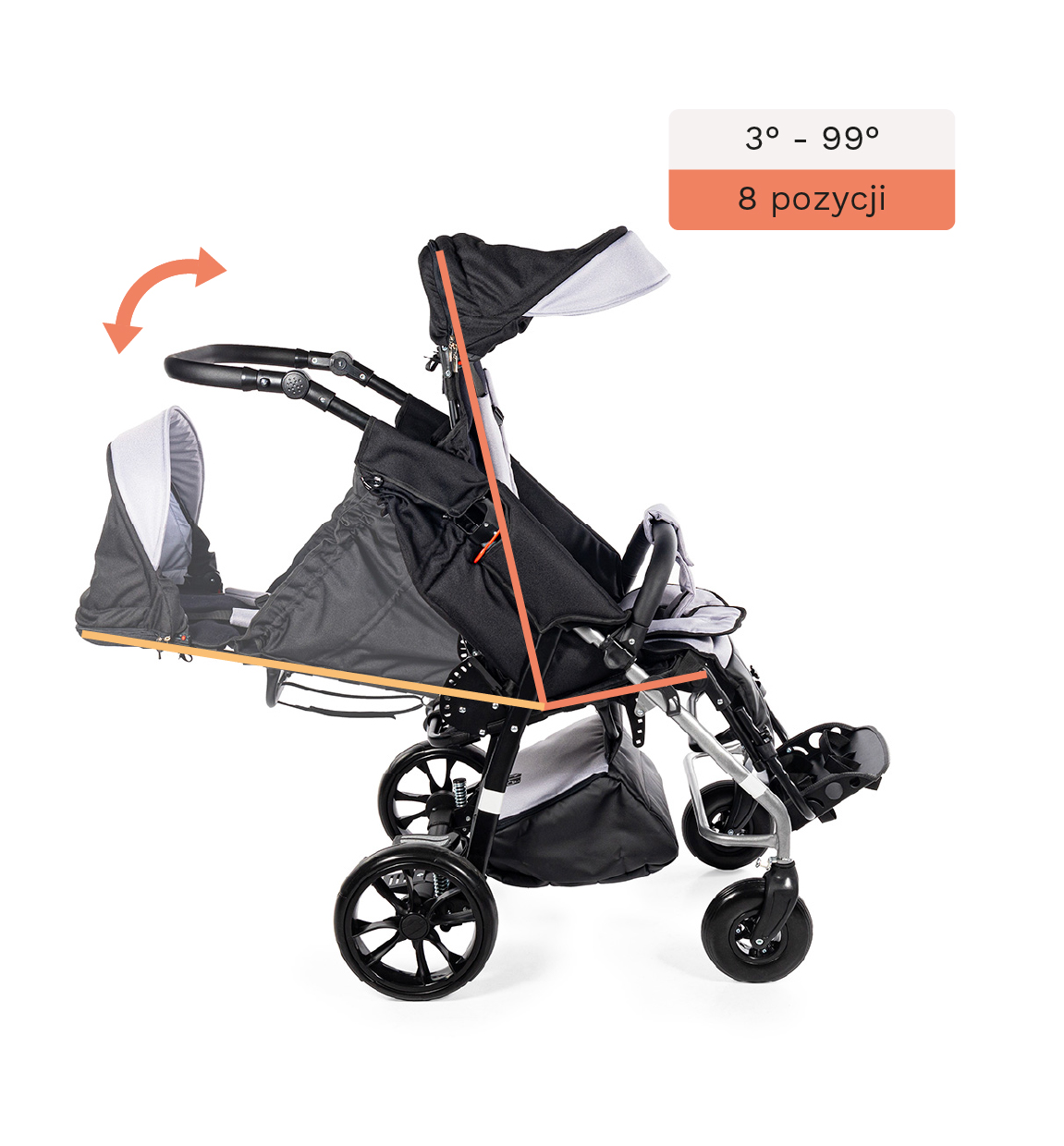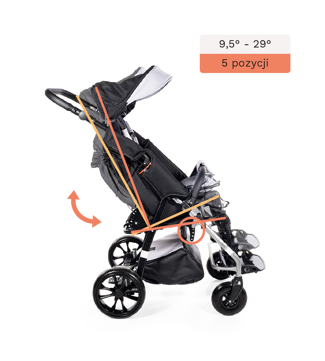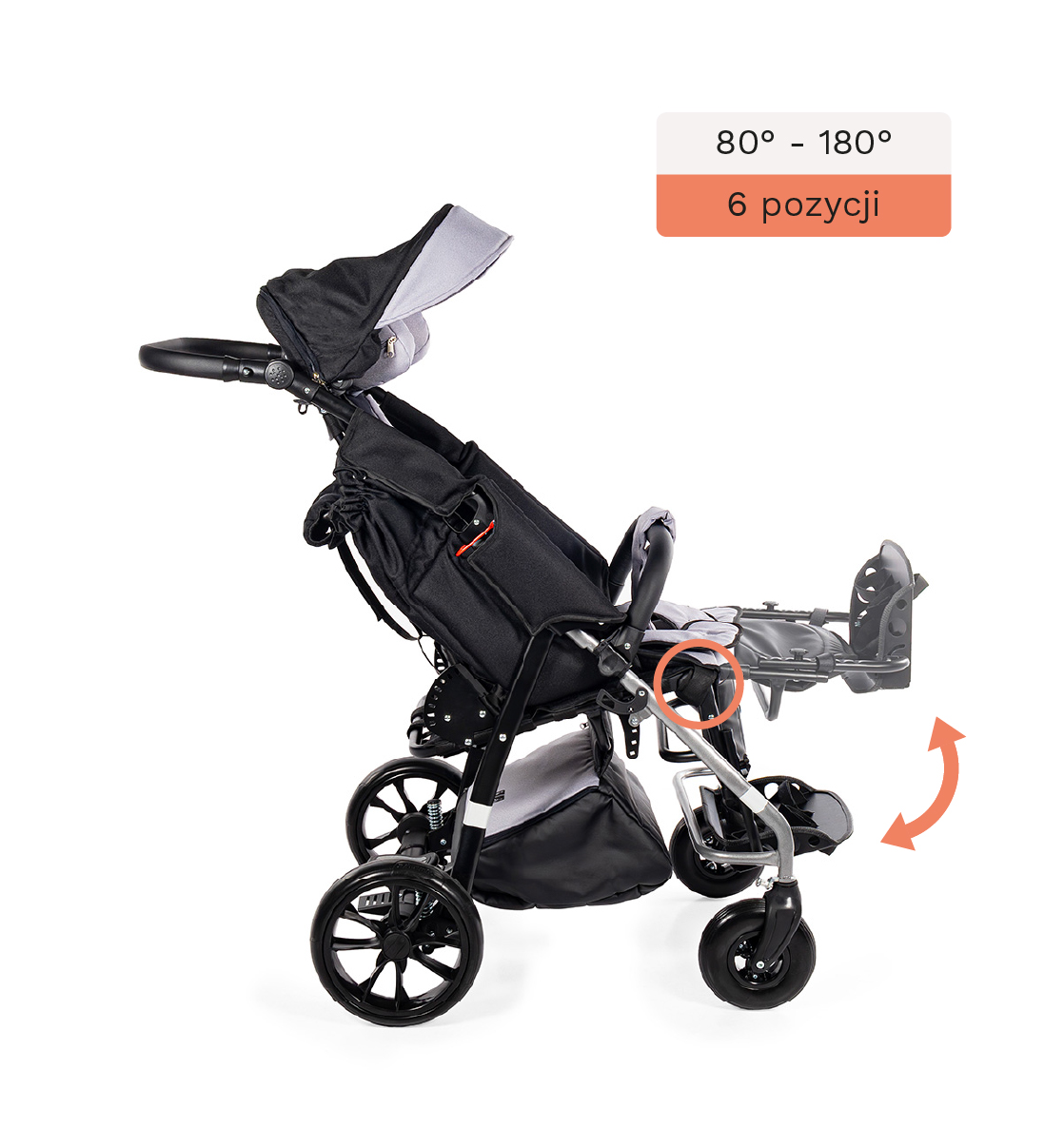 Wózek wyposażono również w system „Rosnę z Tobą”, który dzięki szerokiemu zakresowi regulacji oparcia, siedziska i podnóżka pozwala na idealne dopasowanie do wzrostu i potrzeb dziecka.