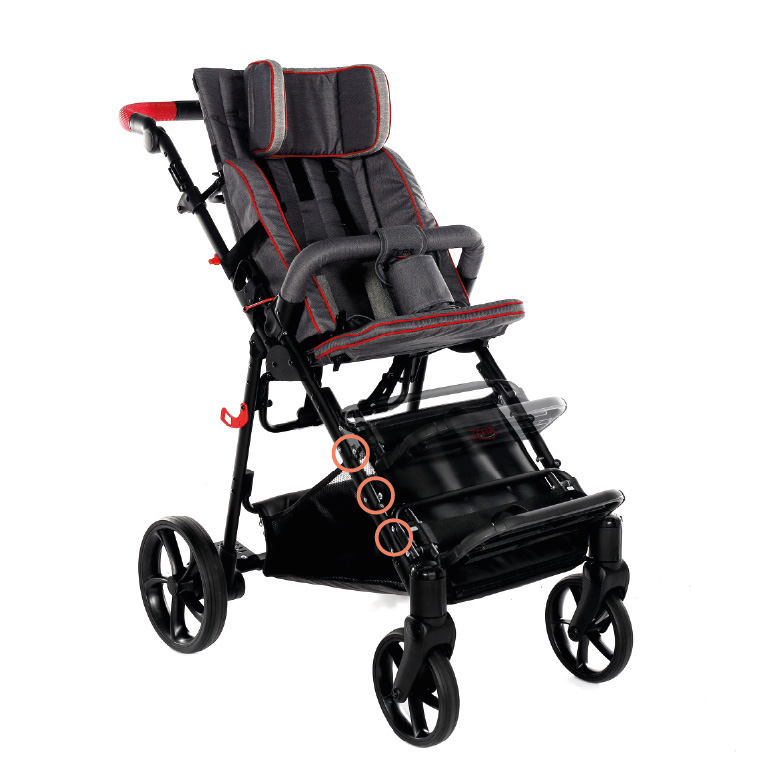 Zakres regulacji oparcia (zwiększenie wysokości poprzez montaż przedłużek), siedziska (dzięki odgięciu jego krawędzi) i podnóżka umożliwia dopasowanie pozycji do potrzeb dziecka.